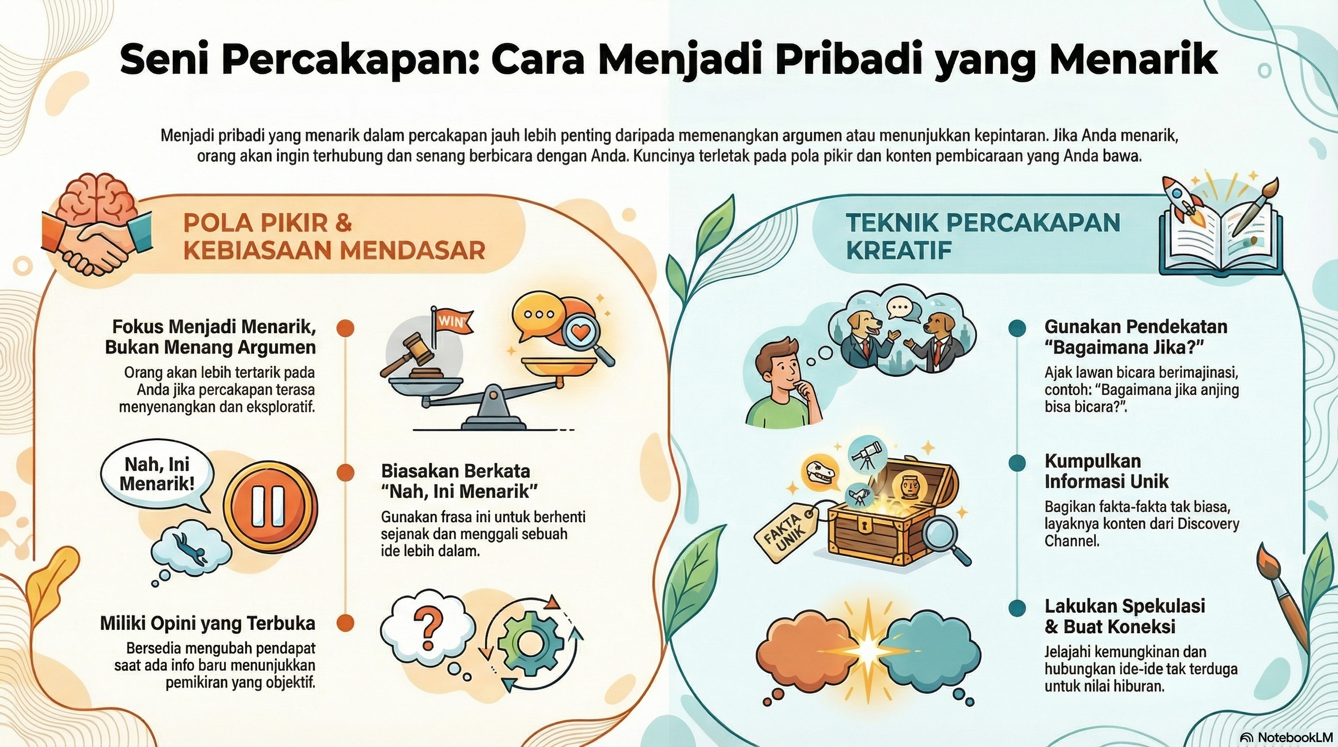 Cara Menarik Minat (Interesting) Orang yang indah secara intelektual mampu membuat topik yang sederhana sekalipun menjadi menarik. Bagaimana Anda bisa membuat topik seperti ‘kodok’, ‘bandara’, atau ‘telur dadar’ menjadi percakapan yang menarik? Inilah letak keindahan pikiran—kemampuan untuk melihat dan mengkomunikasikan hal-hal yang tidak biasa dari yang biasa.