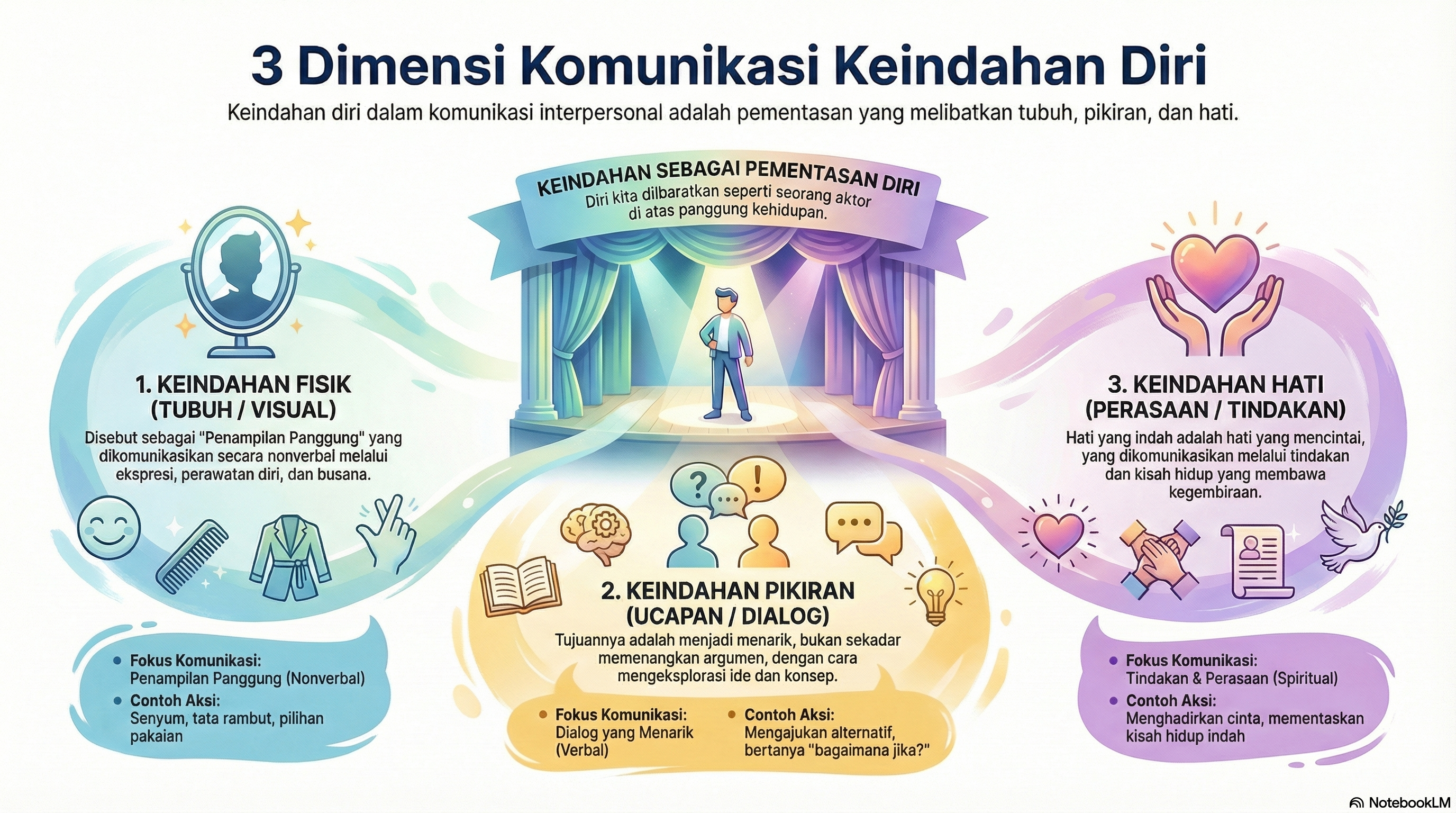 Layaknya seorang aktor di atas panggung, cara kita menampilkan diri, berbicara, dan membawa perasaan adalah sebuah isu komunikasi. Untuk dapat mengkomunikasikan keindahan diri secara utuh, kita perlu menguasai tiga dimensi utamanya: Tubuh (Visual), Pikiran (Ucapan), dan Hati (Perasaan).