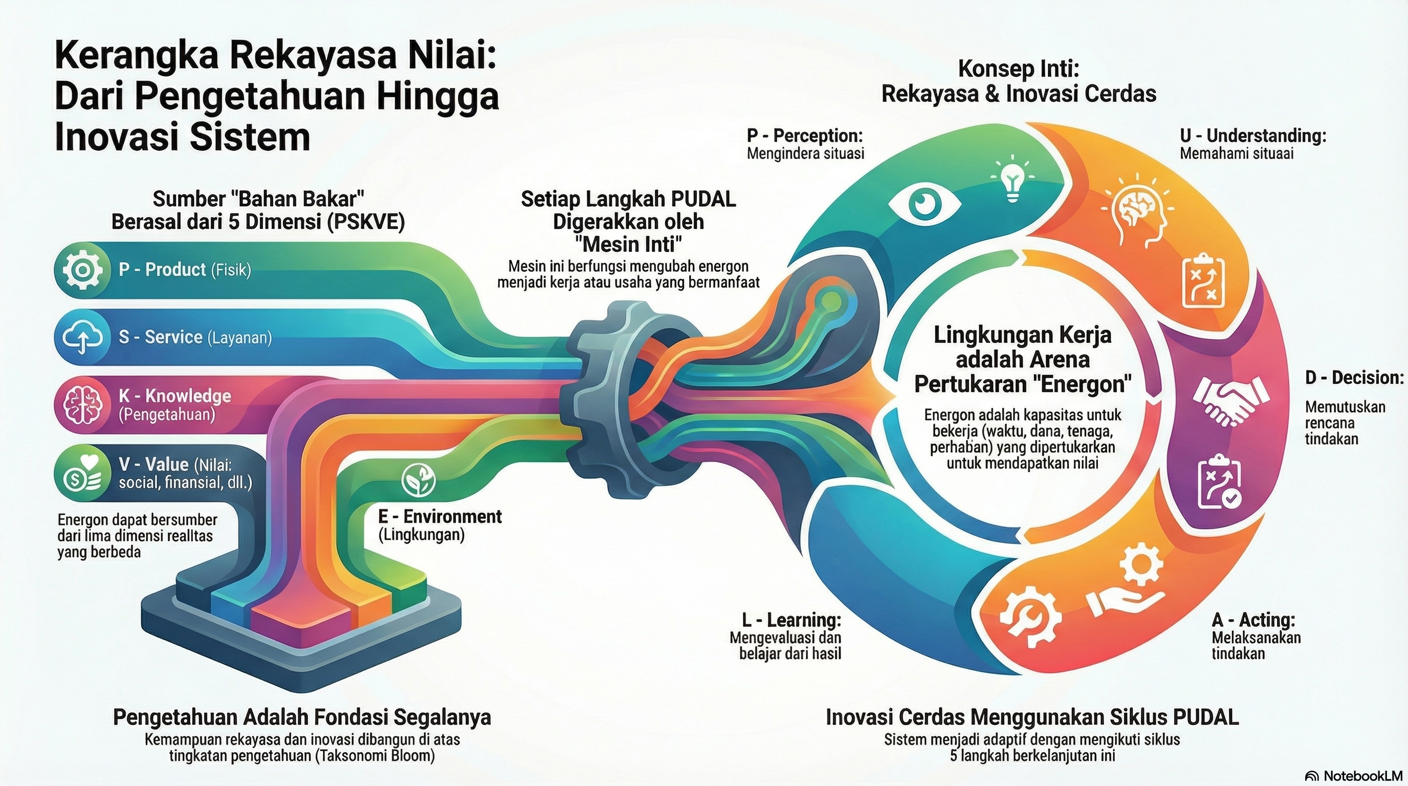 Singkatnya, inovasi TISE 2.0 adalah arsitektur full-stack untuk pemberdayaan: dimulai dari Riset PSKVE (bahan bakar/prinsip), ditenagai oleh CORE Engine (mesin/transducer), dieksekusi oleh Kendaraan PUDAL (agen/kognisi), yang berjalan di atas Rute Siklus 7-Langkah (proses/alur kerja), untuk memindahkan stakeholder antar Stasiun (tujuan/nilai), di dalam Teater Kerja TISE 2.0 (lingkungan pemberdayaan naratif).
